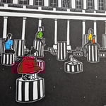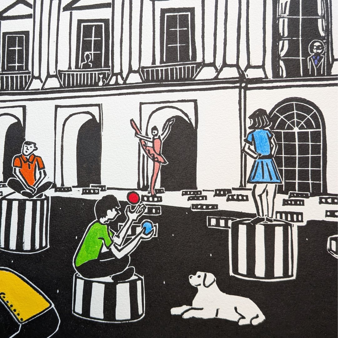 This linocut is set in the inside courtyard at the Palais Royal in Paris, which houses the French Ministry of Culture, as well as the Comédie Française, the oldest theatre company in the world, founded in 1680.