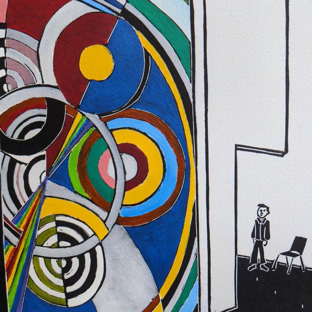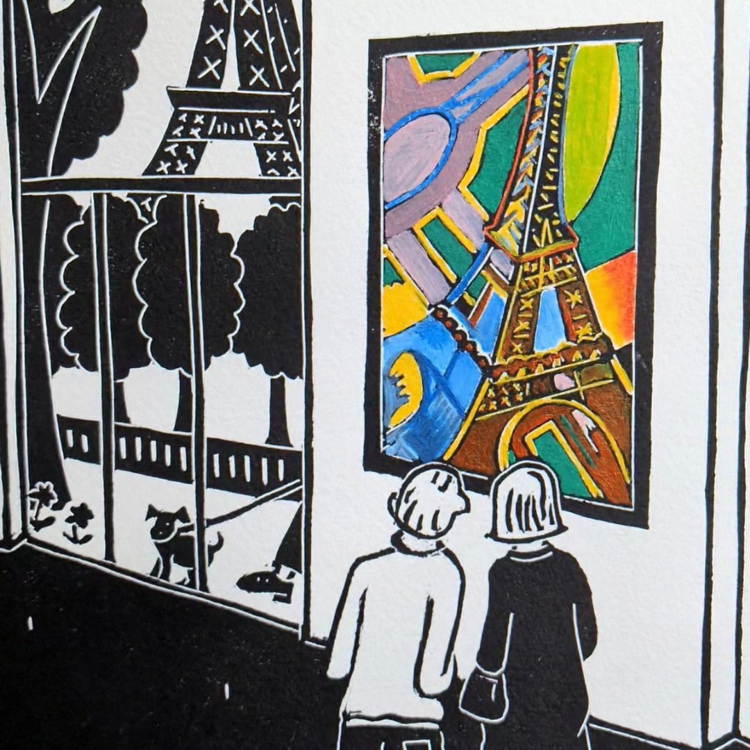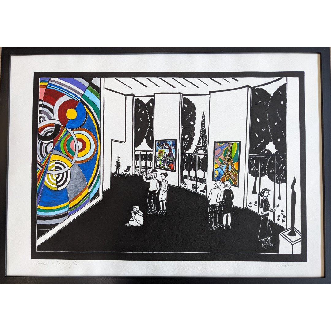 This linocut pays homage to French artist Robert Delaunay of the School of Paris at the beginning of the 20th Century. He and his wife Sonia Delaunay were co-founders of the Oprhism movement which focused on strong colors and geographic shapes. His theories of color and the perception of colored light have influenced numerous artists in his wake.