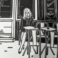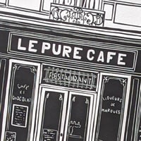 This linocut celebrates the Pure Café, the "quintessential Parisian bistro" on a trendy corner of the 11th Arrondissement. The charming signs on the façade are like a delightful hors-d'oeuvre, inviting one into the cozy interior of a typical Parisian café of La Belle Epoque.